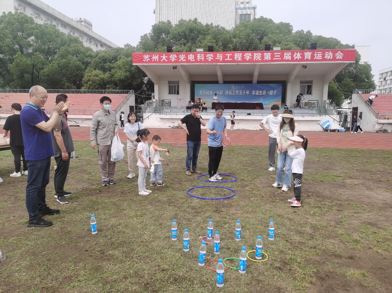 本届运动会,教职工组设夹乒乓球、丢接沙包、运球接力、趣味套圈等四个项目,并首度把亲子趣味的元素添加到运动会中来。赛场上,参赛老师个个精神饱满、斗志昂扬,教职工子女兴致盎然、全情投入,现场加油声、欢笑声不断,教职工及其孩子们度过了一段健康有益、快乐难忘的时光。