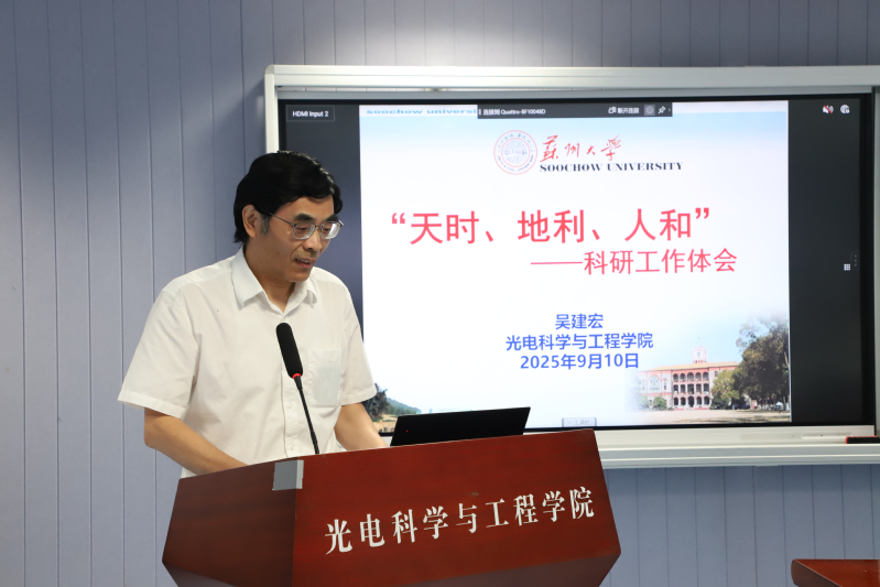 吴建宏老师以《谈谈科研工作中的“天时、地利、人和”》为题作讲座报告。他从国家科研迫切需求的“天时”、学校政策资源支持的“地利”和老一辈科学家悉心指导的“人和”三个维度,回顾了苏大衍射光栅研究的发展历程,并分享了自己近四十年的科研教学工作经历。他结合自身学习工作经历,分享了面向国家战略需求开展自主创新,承担国家科技攻关项目的心得体会;讲述了他坚持言传身教,和学生一起讨论科研项目方案,以严谨的治学态度感染学生的育人故事;回顾了大光栅团队迎难而上,研制出米级大口径光栅并成功应用于国家重大科学装置的奋斗历程。他鼓励青年教师要有“甘坐冷板凳、敢啃硬骨头”的勇气和决心。吴老师真挚的分享为在座的青年教师提供了宝贵的启示。