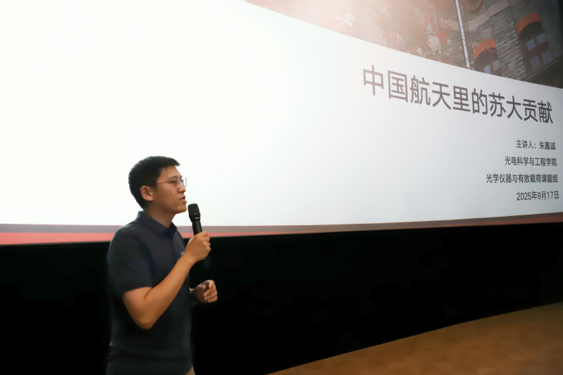 在主题报告环节,青年党员教师朱嘉诚以《中国航天里的苏大贡献》为题,系统回顾学院相关团队多年来凭借先进的光学设计理念、大口径非球面加工和各类衍射光栅研制的核心技术,在中国航天遥感领域持续攻关的历程和重要成果,鼓励师生党员弘扬中国航天精神,向身边的科学家学习,勇于探索、协同攻坚,为实现中国梦奉献青春力量。