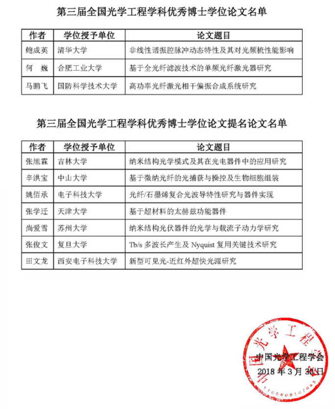 91网站 一篇博士学位论文获中国光学工程学会第三届全国优秀博士学位论文提名奖