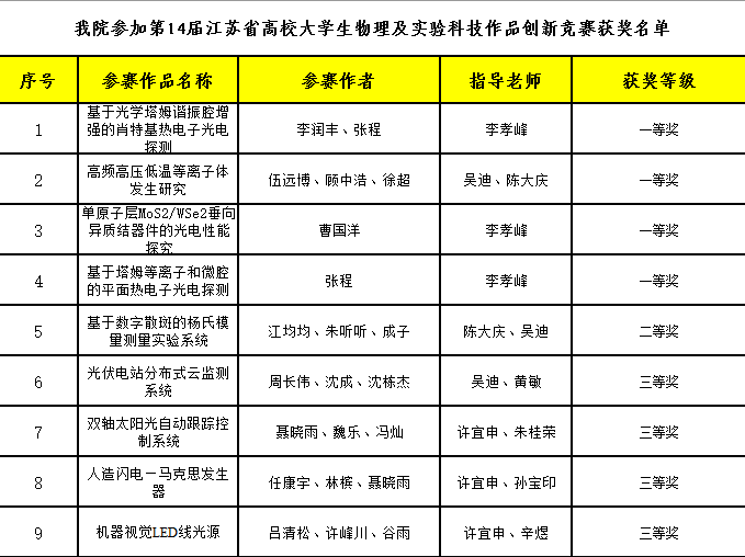 2017年11月24-26日,由江苏省高校大学生物理及实验创新竞赛组织委员会主办,江苏省物理学会、苏州科技大学承办的“江苏省高校第十四届大学生物理及实验科技作品创新竞赛”在苏州科技大学举行。
