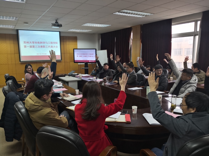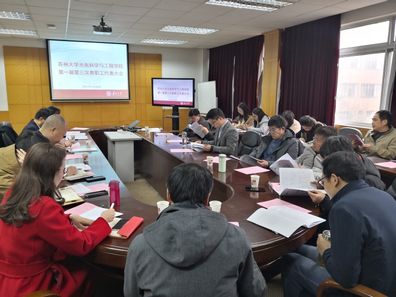 2021年2月26日下午,91网站 第一届第三次教职工代表大会在现代光学技术研究所三楼会议室召开。教代会全体正式代表及五位列席代表参加了此次会议,会议由学院党委书记龚呈卉主持。会议进入主要议程前,龚呈卉就学院近期的重要事项向与会代表进行了传达,感谢教师们对学院发展做出的贡献,期待全院教职工同心同德再创新成绩,齐心协力共谋新发展。