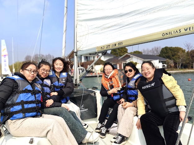 随着帆船体验活动的开启,在专业指导人员的讲解下,大家了解了帆船运动的来源和基本技巧。随后,大家纷纷结伴上船,体验乘风破浪的乐趣。有的沉浸于暖阳和轻风之中,在船上欣赏碧波与美景;有的则在专业人员的指导下,齐心协力、挑战自我,勇敢且冷静地调整船帆和船舵。在宽阔的湖面上航行,体育运动带来的健康与快乐荡涤着每位参与者的身心,湖水和浪尖见证了每位女教职工的热情与活力。