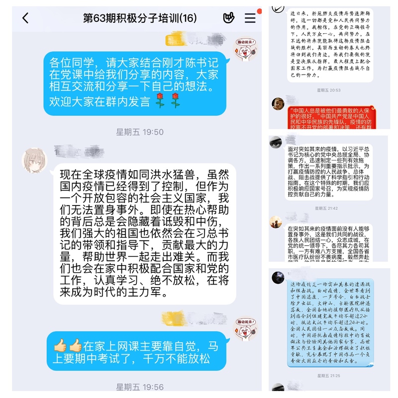 党课结束后,各党支部分别组织开展了线上“云讨论”活动。各位党员和入党积极分子结合此次党课学习的内容,积极分享了自己对当前疫情防控工作的思考。同学们在讨论过程中相互碰撞思想火花,更加充分地认识了在新时代新要求下当代青年大学生所承担的责任,也更加明确了自己今后努力和前进的方向。