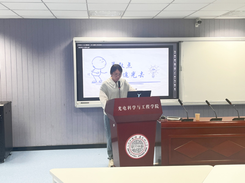 随后,支部优秀学生党员丁艳慧着重分享了自己参加中国国际大学生创新大赛的经历与收获。2023年,她与团队从省赛一路披荆斩棘闯入国赛,最后以优秀的成绩获得了国赛金奖。她认为三大赛对于本科生来说,机会与挑战并存,在参加比赛的一年里,她的演讲能力、文书能力、抗压能力和个人综合素质都得到了很大的提升。但她也遇到了许多困难,比如对商业计划书的一筹莫展、面对专家质疑的不自信、专业课程学习与竞赛之间的时间平衡等等。面对这些困难,丁艳慧向与会学生们分享了三点建议,她希望同学们可以努力做到“自信、坚持、责任感”,学会安排好时间,学会取舍。最后她鼓励大家面对艰难险阻,要坚持努力下去,相信“路虽远,行必至”。