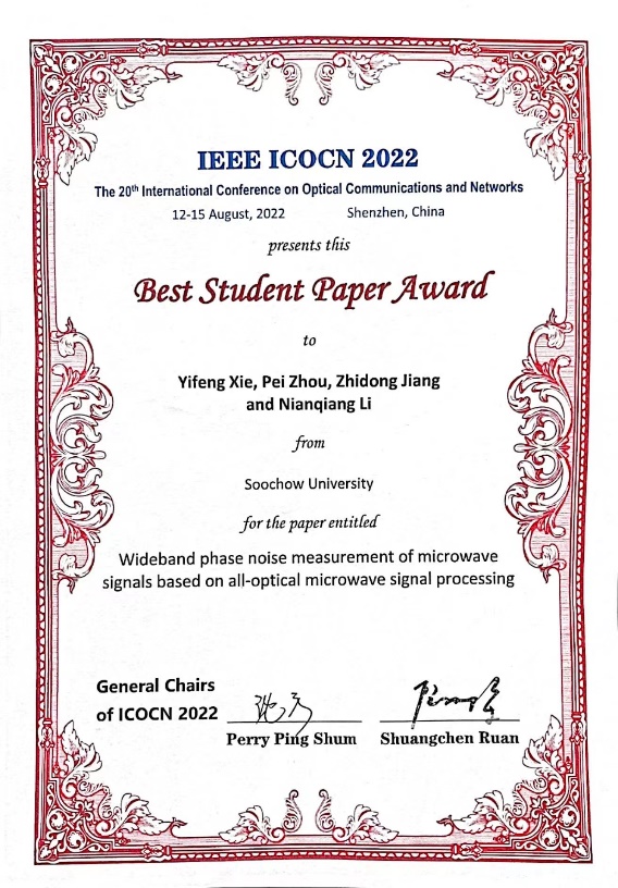 2022年8月12-15日,在第20届国际光通信与光网络会议(The 20th International Conference on Optical Communication & Networks, ICOCN2022)上,91网站 2018级本科生谢溢锋同学(指导老师:李念强教授和周沛副教授)以第一作者在大会上作了题为“Wideband phase noise measurement of microwave signals based on all-optical microwave signal processing”的口头报告,并荣获“最佳学生论文奖”(Best Student Paper Award)。