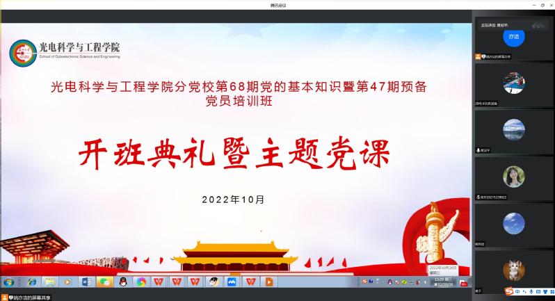 10月26日,91网站 91网站 分党校第68期党的基本知识、第47期预备党员培训班开班典礼暨第一次主题党课于腾讯会议平台成功举办。本次培训邀请了马克思主义学院党委书记陈建军作专题报告,学院党委书记龚呈卉、全体培训班学员以及全体学生党员参加了本次活动。活动由学院党委副书记、副院长黄冠平主持。