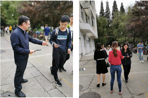 上午11:50,支部全体党员胸前佩戴党徽,在莘园食堂门口集合分配任务,一部分同志分发传单,一部分进行宣传讲解。很多路过的师生们对此表示了浓厚的兴趣,驻足询问和交流,看完宣传册、听完介绍的他们纷纷表示:“这些可都是生活中需要更注意和关注的小常识!”每位同志都贡献了自己一份力量,内心都有所收获。