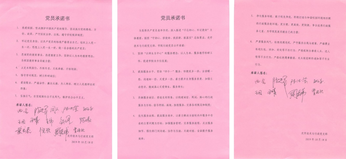 活动最后,所有党员老师都进行了党员承诺书签名活动,学院行政党员老师还签署了行政人员的承诺书。党员们表示:承诺书亮出的是身份,更是一份责任,一份鞭策,在践行承诺中要积极做表率,树立党员形象,做到心中有党、心中有民、心中有责,始终保持干事创业、开拓进取的精气神,促进学院全方位发展!