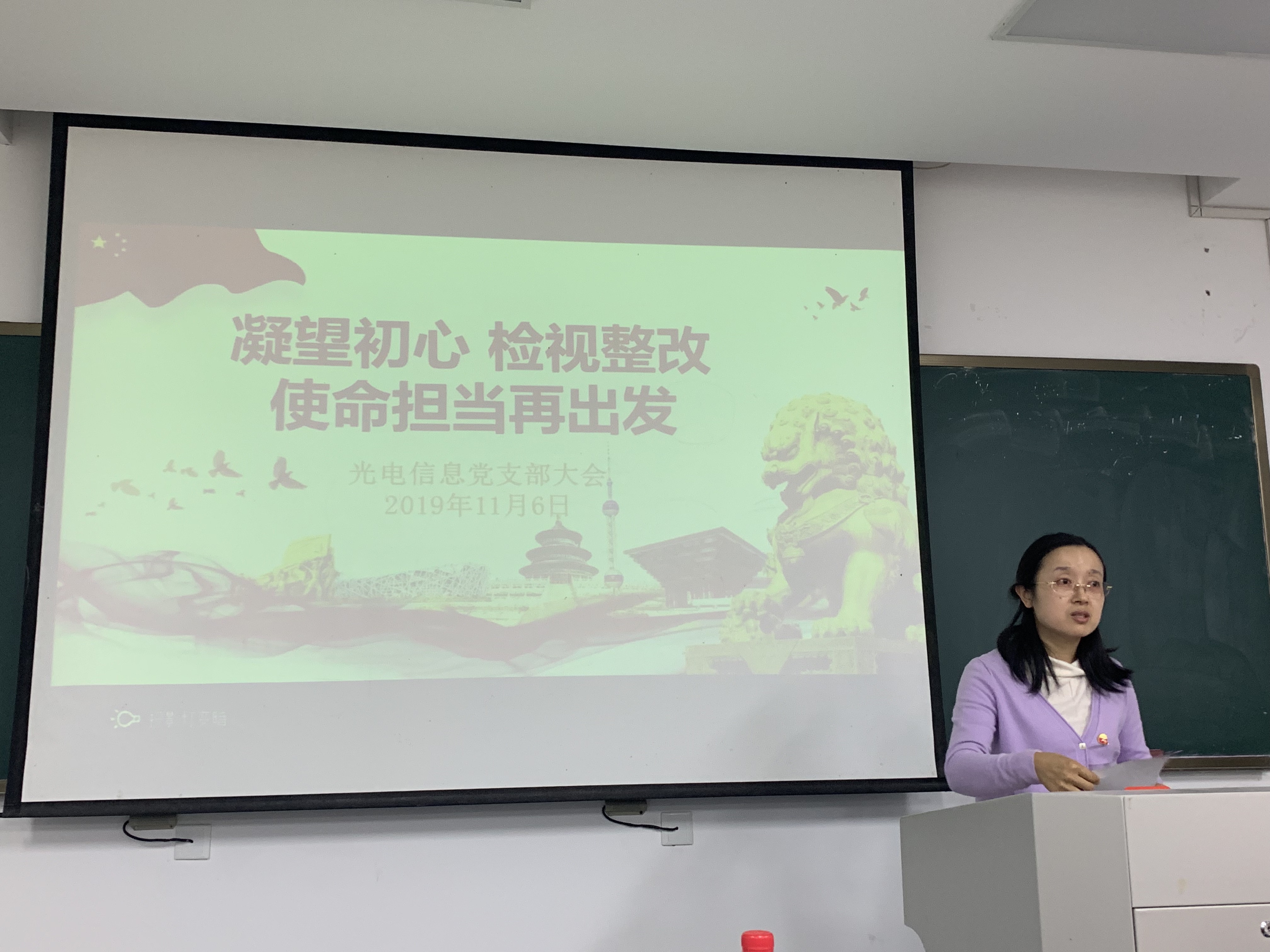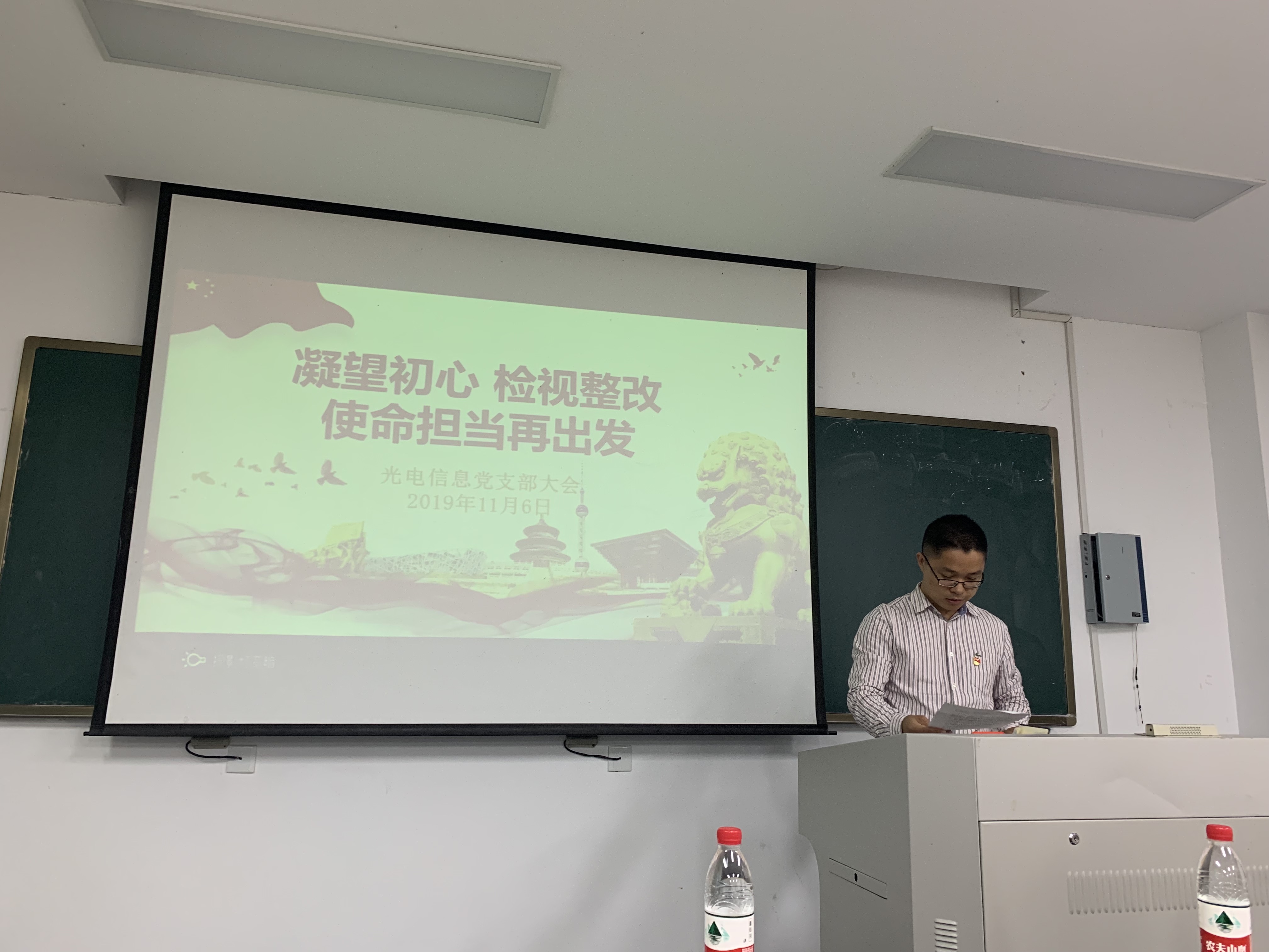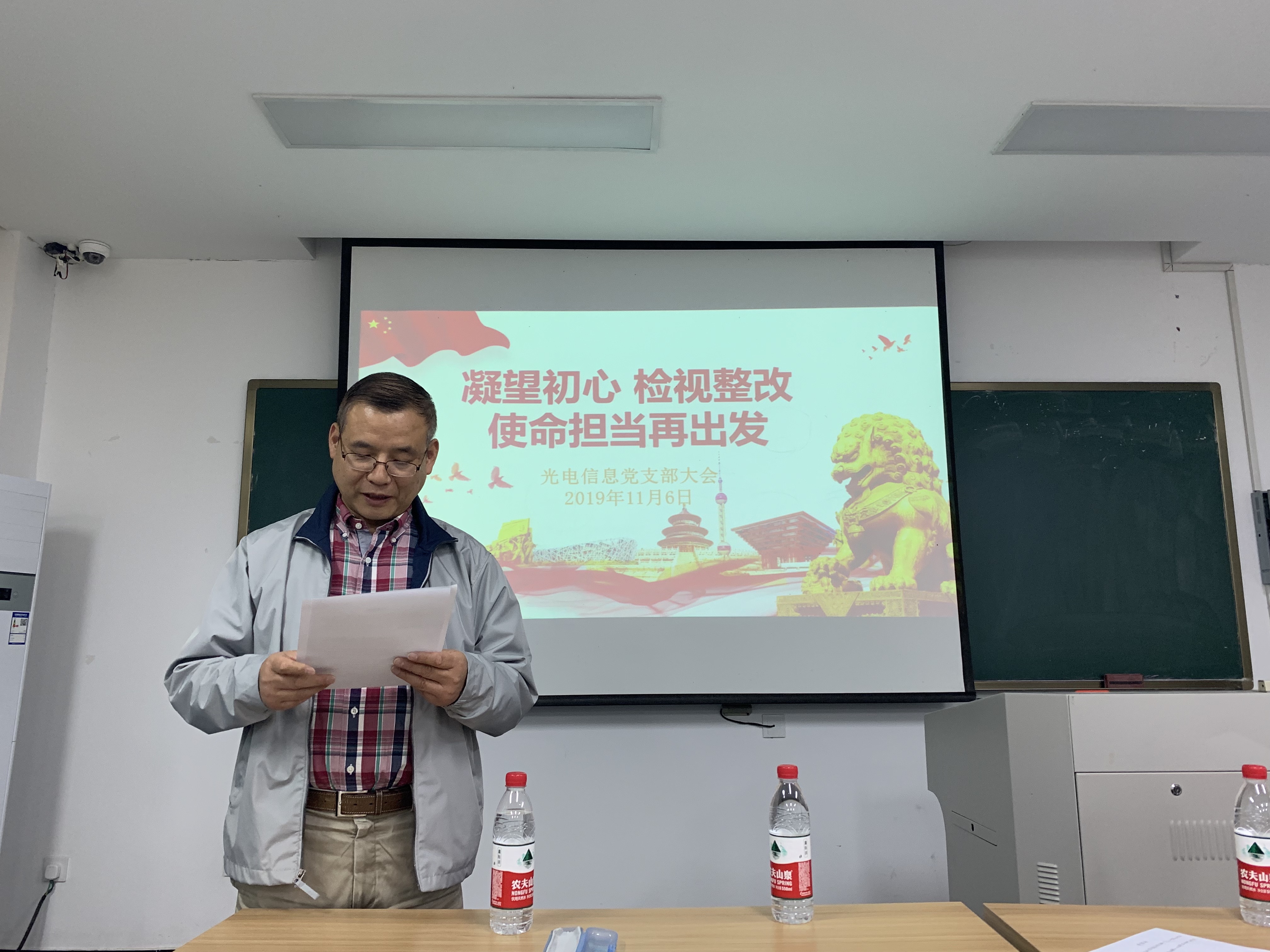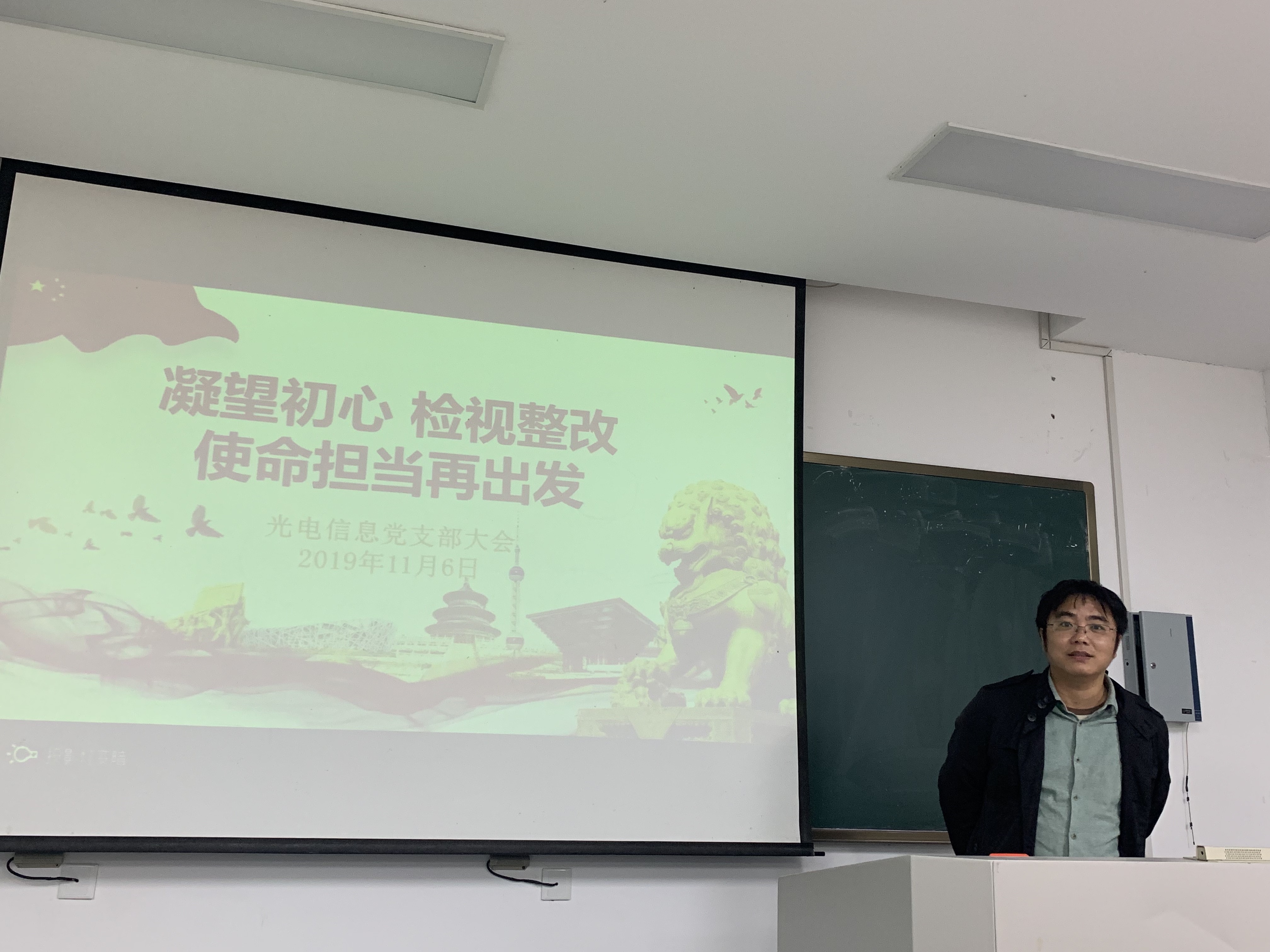 为深入开展“不忘初心、牢记使命”主题教育,充分发挥党支部主体作用,抓好抓实基层党支部、党员学习教育和检视整改,确保主题教育各项工作落细落实落深,光电信息党支部在2019年11月6日下午13:10在鸿远楼101教室开展“凝望初心 检视整改 使命担当再出发”支部大会及光电本科生导师制宣讲会主题党日活动。支部大会共有18名党员老师参加活动,4名老师(李孝峰、吴丹、邹文龙、王钦华)因工作情况请假。