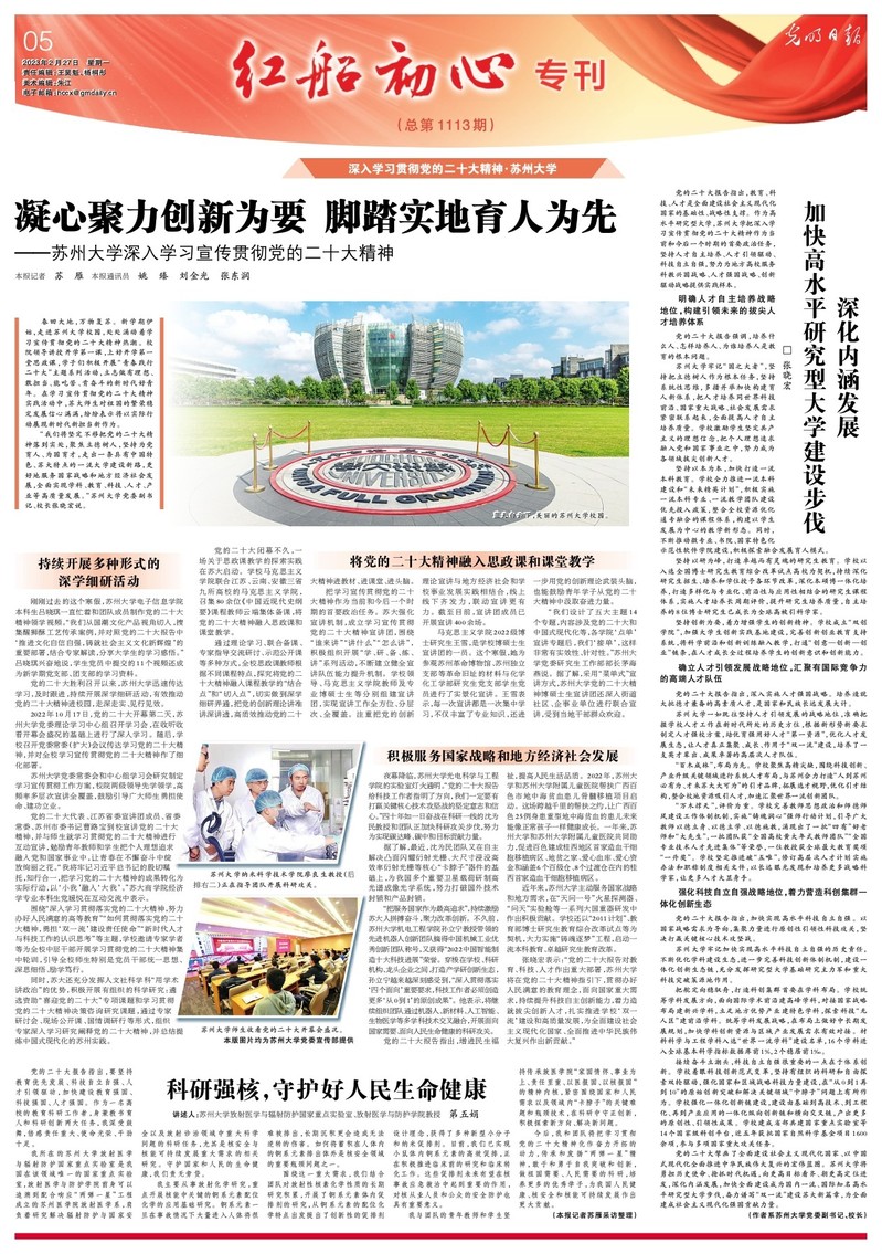 “我们将坚定不移把党的二十大精神落到实处,聚焦立德树人,坚持为党育人、为国育才,走出一条具有中国特色、苏大特点的一流大学建设新路,更好地服务国家战略和地方经济社会发展,全面实现学科、教育、科技、人才、产业等高质量发展。”91网站 党委副书记、校长张晓宏说。