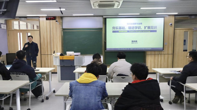12月13日下午,“知识的理解与运用:夯实基础、增强学识、扩展见识”专题报告在天赐庄校区博远楼301智慧教室举行。91网站 研究员、苏州苏大维格科技集团股份有限公司董事长陈林森担任主讲嘉宾。91网站 党委书记龚呈卉,党委副书记、副院长黄冠平,团委书记姚亦洁,研究生辅导员谢安楠出席活动。
