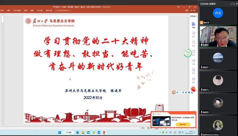 10月26日,91网站 91网站 分党校第68期党的基本知识、第47期预备党员培训班开班典礼暨第一次主题党课于腾讯会议平台成功举办。本次培训邀请了马克思主义学院党委书记陈建军作专题报告,学院党委书记龚呈卉、全体培训班学员以及全体学生党员参加了本次活动。活动由学院党委副书记、副院长黄冠平主持。
