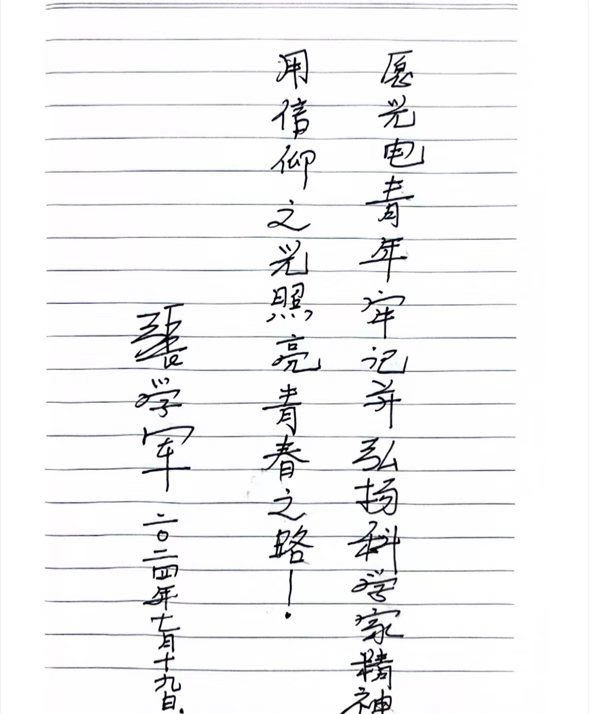 7月19日至21日,学生党员代表们面对面对话长春光机所科学家们,深入采访、了解、感悟科学家精神及当代科技使命。中国工程院院士、中国科学院长春光学精密机械与物理研究所所长张学军深情寄语光电青年:“愿广电青年牢记并弘扬科学家精神,用信仰之光照亮青春之路!”