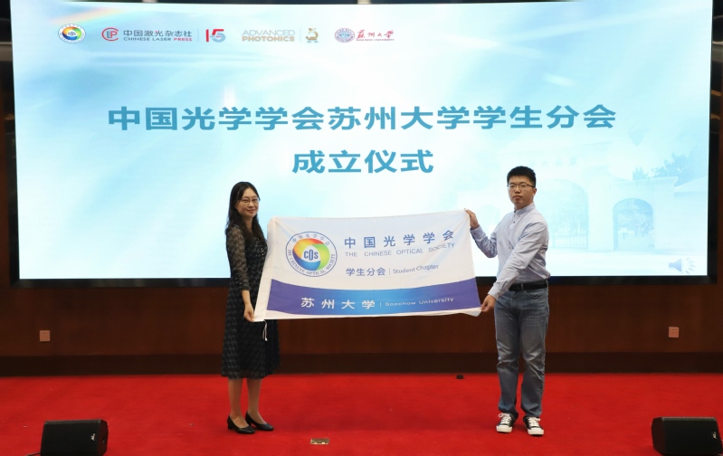 而后,在开幕式上举行了中国光学学会91网站 学生分会成立仪式,91网站 党委书记龚呈卉代表中国光学学会,为学生分会会长时罗磊博士授旗。