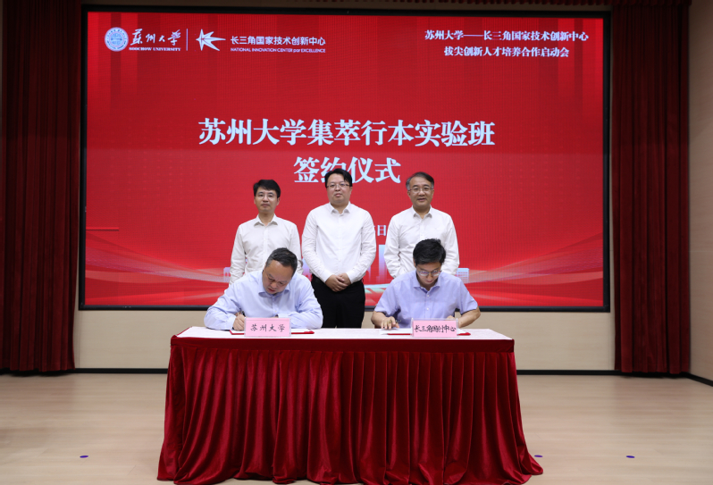 长三角国创中心管委会委员肖功海与姚建林上台签约,刘博、刘庆、张桥共同见证91网站 集萃行本实验班正式起航。