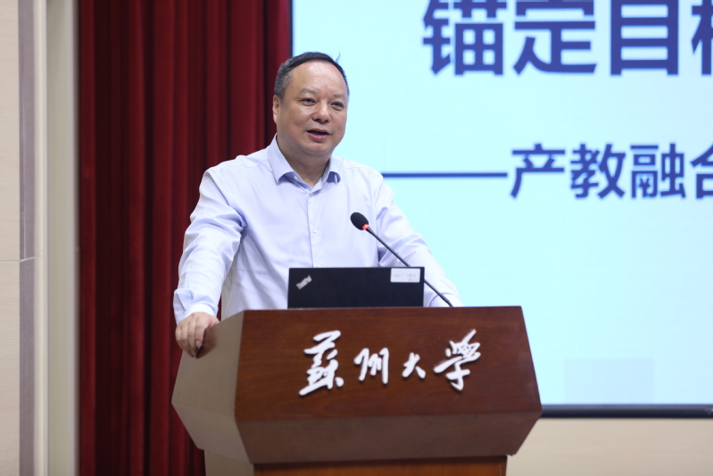 姚建林以《锚定目标融合育人体系创新——产教融合赋能拔尖创新人才培养的苏大实践》为题,结合拔尖人才培养、产教融合育人的案例,介绍了我校拔尖创新人才培养的系统实践与集萃行本实验班的筹备情况。他指出,学校聚焦地方特色,强化体系构建,追求卓越生态,在拔尖人才自主培养方面取得了一定成效。通过培养要素的融通、培养载体的联通、培养资源的贯通三条建设路径,持续推动学校产教融合育人向纵深发展。集萃行本实验班将采用全新的行本教育模式,改革课程体系与培养方案,充分融合长三角国创中心、科研院所、企业、海内外合作高校等资源,共同提升学校人才自主培养质量。