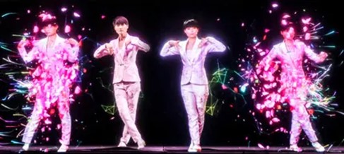 2015年羊年春晚,一席粉红色套装的李宇春进行了“分身”,舞台上出现了“四个李宇春”同台献唱了一首《蜀绣》。探秘《蜀绣》的现场调试照片我们就能够发现,这场表演中最关键的技术点,就是现场表演者李宇春身后那几张倾斜45°的全息薄膜屏。其实所有的三维仿真人物影像的呈现,都是经过前期拍摄,再经过后期抠像处理,通过叠加视频特效合成制作出的。通过将其投影到设计师们精心调试放置全息薄膜屏上,“李宇春、李宇夏、李宇秋、李宇冬”四姐妹的同台表演便出现了。