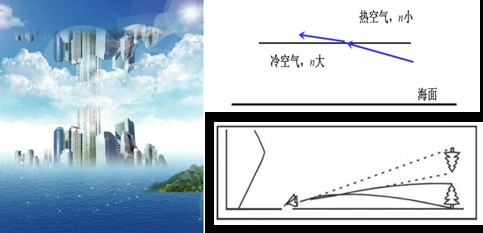 光的反射定律由法国土木工程兼物理学家菲涅耳提出。他发现了反射与视点角度之间的关系。因此,光的反射又称为菲涅耳反射。反射光线和入射光线与垂直于光入射平面的法线,在同一平面内;入射线同法线组成的角称为入射角,反射光线同法线组成的角称为反射角,反射角等于入射角。折射定律最早由法国数学家费马予以确定,并给出有名的费马定理。折射定律,通俗来说就是当光经过两种不同材料的界面时,光的传播方向会发生改变,即光不再沿同一条直线路径行走。海市蜃楼的形成便与光的折射密切相关。例如,沙漠或海边,处在不同位置的气压不同,导致空气的冷热也不同,也就是空气的稀薄程度不一样,即每一层空气的光学折射率也不相同。当远处较低物体反射出来的光,从下层较密空气进入上层较疏空气时被不断折射,其入射角逐渐增大,增大到等于临界角时发生全反射,这时,人要是逆着反射光线看去,就会看到海市蜃楼现象。