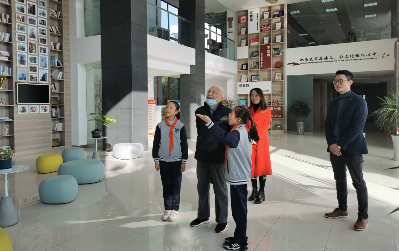 园区二实小的小朋友们见到潘君骅院士非常激动,小导游代表热情地带领潘院士参观了校园文化长廊和校史馆。潘院士对小朋友们的社团作品和获奖成果印象深刻。