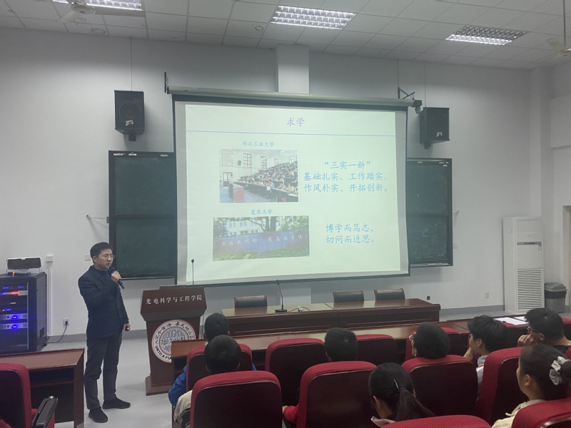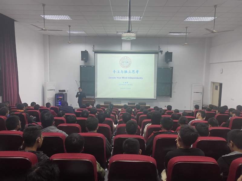 为扎实推进落实立德树人的根本任务,培养担当民族复兴大任的时代新人,校党委统战部联合校欧美同学会(留学人员联谊会)组建了第二届青年海归学者讲师团,面向全体2020级新生推出系列讲座。2020年11月4日晚,91网站 光电科学与工程学院特聘副教授王绍军老师作为青年海归学者讲师团成员,受邀在现光所三楼阶梯教室为全体2020级光电新生作了题为“专注与独立思考”的主题报告。报告由学院辅导员姚亦洁主持。