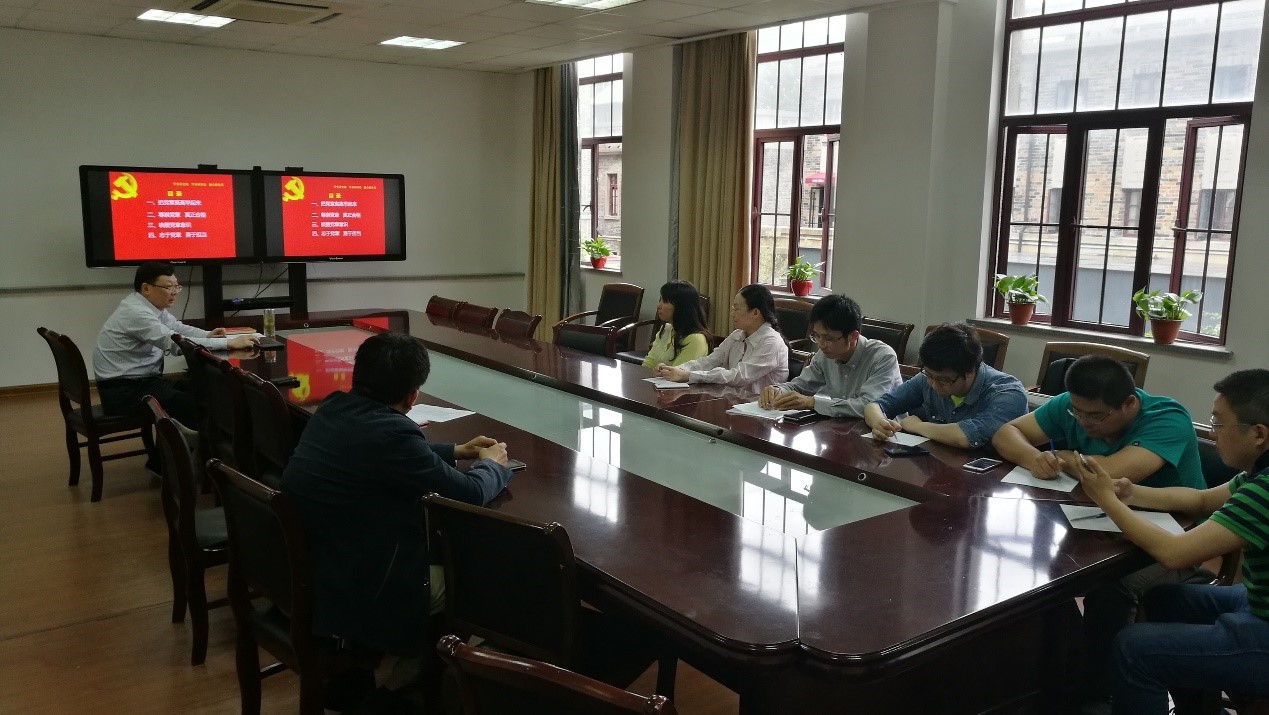 6月1日下午1:30,物理与光电·能源学部光电信息科学与工程学院陈建军书记在博习楼221会议室,为学院光电技术支部党员上题为“学党章、修党性,做忠诚干净担当的合格共产党人”专题党课。党课由光电技术党支部书记许宜申主持。