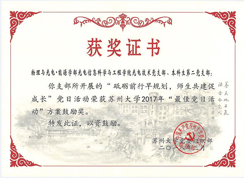 光电技术党支部联合本科生第二党支部报送的“砥砺前行早规划,师生共建促成长”的主题党日活动获得了鼓励奖。