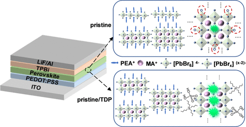 摘要:Quasi-two-dimensional (quasi-2D) perovskite has exhibited great potential to be an ideal luminescent material for perovskite light-emitting diodes (PeLEDs). However, the low-order phases (especially n = 1 phase) and the inevitable defects result in massive nonradiative recombination and poor emission efficiency. Herein, a multifunctional molecule of tetrabutylammonium dihydrogen phosphate (TDP) is introduced to simultaneously suppress the low-n phase, passivate the defects, and increase the exciton binding energy of the quasi-2D perovskite for massive radiative recombination and thus high emission efficiency. The multifunctional roles of TDP are realized by the synergistic effects of tetrabutylammonium cation and dihydrogen phosphate anion, both of which show strong interaction with the lead bromide octahedron of the perovskite. As a result, the TDP-incorporated perovskite films show a great enhancement of the emission efficiency with a remarkable increase in photoluminescence quantum yield (PLQY) from 34.6 to 96.9% at the wavelength of 522 nm. The strengthened radiative recombination promotes efficient emission efficiency with over 2.5-fold improvement in external quantum efficiency (EQE) and current efficiency (CE) from 3.27% and 10.83 cd A–1 to 9.25% and 28.35 cd A–1, respectively, as well as high brightness with over 37% enhancement from 12713 to 17536 cd m–2. Consequently, this work contributes to an efficient approach to employ a multifunctional molecule for highly emissive quasi-2D perovskites and enhanced quasi-2D PeLED performances.