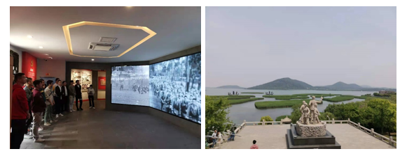 经过一个多小时的车程,党员们来到了位于太湖边的新四军太湖游击队纪念馆。在讲解员的带领下,全体人员拾级而上,面朝太湖湖畔景色秀丽的芦苇荡。当年的太湖游击队战士就是在这片芦苇丛中与日寇周旋抗争,直至抗战全面胜利。